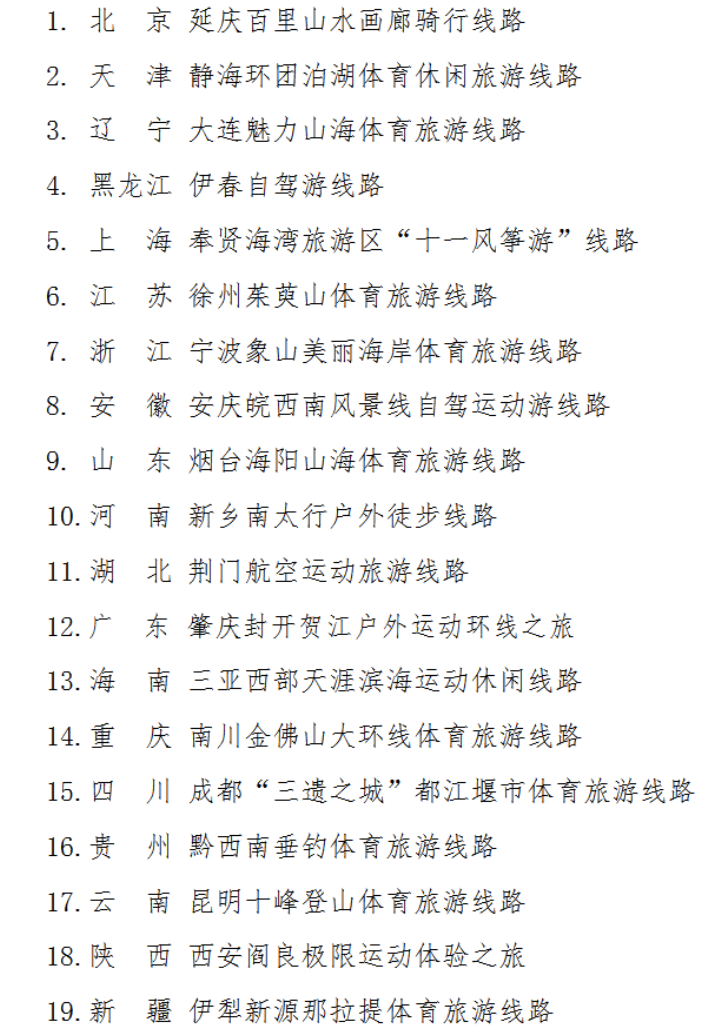 为深入贯彻党的十九大和十九届二中、三中、四中、五中全会精神,全面落实“健康中国”国家战略,践行“绿水青山就是金山银山”“冰天雪地也是金山银山”发展理念,促进体育产业与旅游产业融合发展,满足常态化疫情防控形势下人民群众不断增长的户外运动需求,国家体育总局、文化和旅游部联合发布“2021年国庆假期体育旅游精品线路”。它们是: