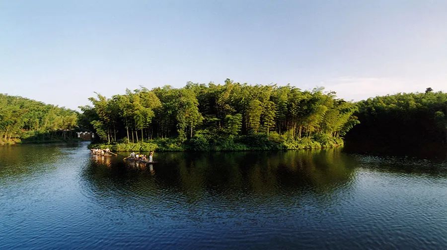 临水而建的竹亭、竹寨,在翠竹的掩映下,绚丽多彩。绿的山,翠的竹,清的湖,又构成了一幅幅美丽的水彩画卷。通往仙女湖的青石板路,道路延伸至远方,两旁高竹林立,给人幽深宁静的感觉。