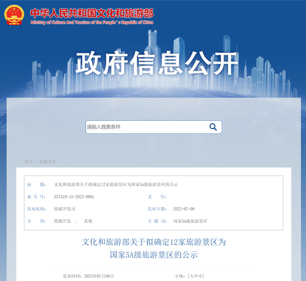 7月6日,文化和旅游部发布《文化和旅游部关于关于拟确定12家旅游景区为国家5A级旅游景区的公示》。公告确认拟新增12个5A级旅游景区: