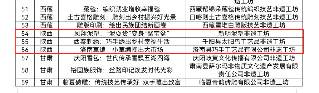 近日,文化和旅游部公布2022年度关于“非遗工坊典型案例”推荐名单的公示:陕西省“凤翔泥塑、西秦刺绣、洛南草编”作为陕西省推荐案例成功入选。