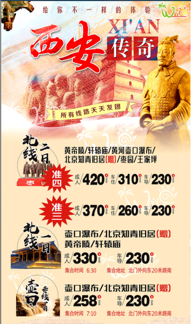2、景区电瓶车;兵马俑 5 元/人华清池 20 元/人骊山索道 60/人往返 (自愿自费)