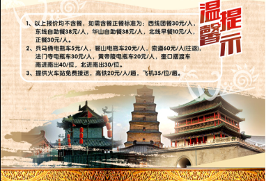 1、各景区及餐厅内有售旅游纪念品,有关于陕西特产及各景点书籍出售,请您自愿选择购买。