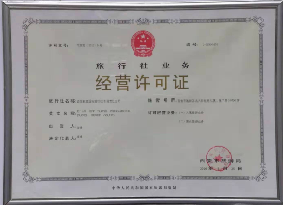 1、依法注册,合法正规。西安新旅国际旅行社有限责任公司(统一社会信用代码:91610104MA6TXF953Q)是经过工商局和旅游局双重审批的一家综合性旅游企业注册资金500万元,并按国家规定足额缴纳旅行社质量保证金。公司主要经营国际旅游接待业务、入境旅游业务、国内旅游业务、会议会展服务、礼仪庆典策划组织等服务,是一家大型涉外旅游企业。