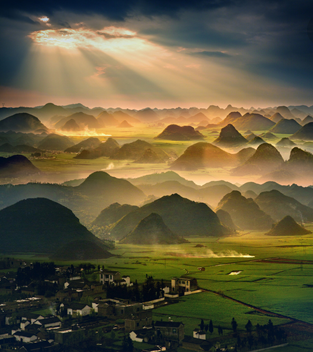注:万峰林脚下是一片油菜花海,每年1月底当油菜花竞相开放时,映衬着万座山峰,可谓“大峰小峰落金盘”。电瓶车穿过花海,春天的气息扑面而来。